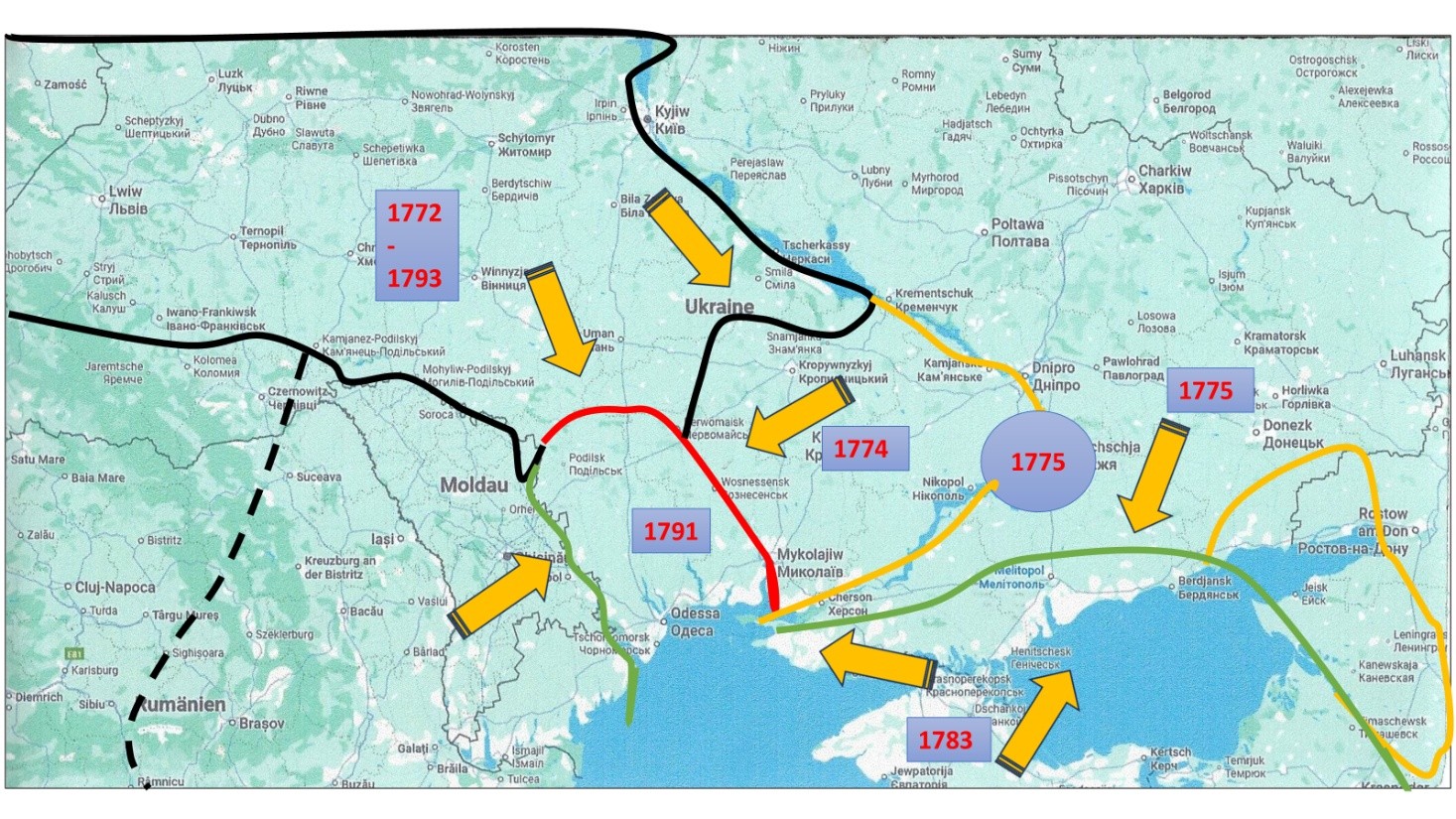 В 1768 году Россия нападает на Османскую империю. Война длится шесть лет и заканчивается подписанием Кючук-Кайнарджийского мирного договора, согласно которому Россия получила выход к кусочку Черного моря в степях между Днепром и Бугом и продавила федерализацию Османской империи — Крым стал автономным образованием в ее составе.